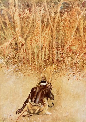 Qua thời gian dài đứng giữa ranh giới nắng râm, lại thêm những bóng cây dài lê thê in hằn lên thân thể, Hươu cao cổ trở nên lốm đốm, Ngựa vằn khoác lên mình những sọc vằn, còn Linh dương Eland và Koodoo thì sẫm màu hơn, với những đường gợn sóng màu xám nhạt trên lưng tựa như vỏ cây; thế nên, dù bạn có thể nghe tiếng chúng hay đánh hơi thấy chúng, bạn sẽ hiếm khi nhìn thấy chúng, trừ phi biết chính xác chỗ cần nhìn. Chúng sống những ngày tháng tuyệt vời giữa những vệt bóng loang lổ, lấm tấm của khu rừng, trong khi con Báo và người Ethiopia lang thang khắp vùng High Veldt vàng nâu xám xịt bên ngoài, băn khoăn không biết cả bữa sáng, trưa lẫn tối của chúng đã biến đi đâu.