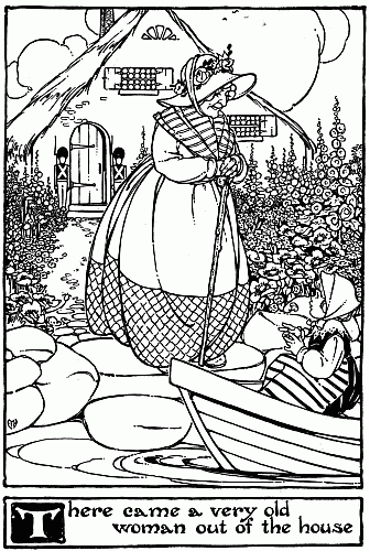 “Ôi đứa bé tội nghiệp,” bà lão lên tiếng, “sao con có thể đi xa đến thế trong thế giới mênh mông này, lại trên dòng sông chảy xiết, cuồn cuộn như vậy?”